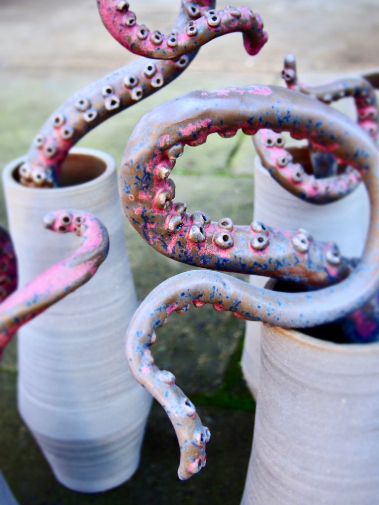 MEER davon: Quallen, alle Arbeiten mit Kraken-Armen (Galeriebereich oben und unten), Keramiklandschaft am Eingang Vasen und Dosen: alle Vasen, Ringvasen und Dosen MEERchandise: MEER DAVON Geschirrserie MEER Genuss: Keramik die heute mit Genuss bespielt wird Geschirr: Wave-Geschirrserie, Geschirr, Schalen, Teeschalen usw. in den Ausstellungsküchen MEER zur Ausstellung: Alles rund um die Entstehung der Arbeit, Beweggründe der Keramikkünstlerin