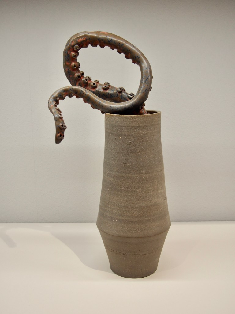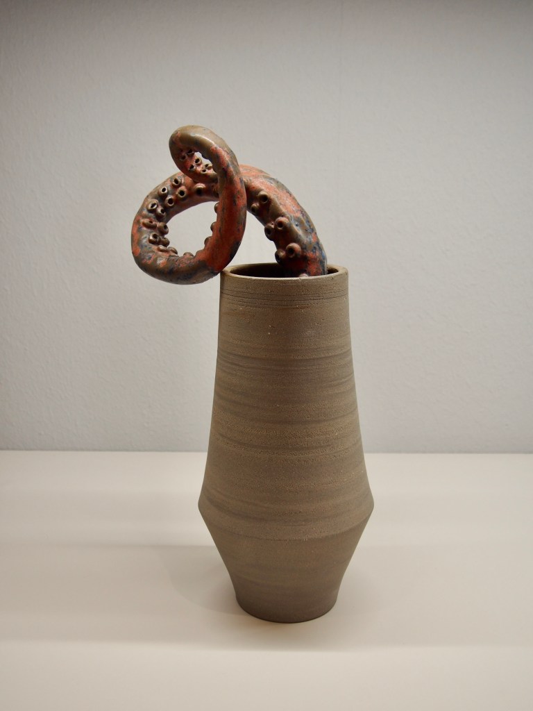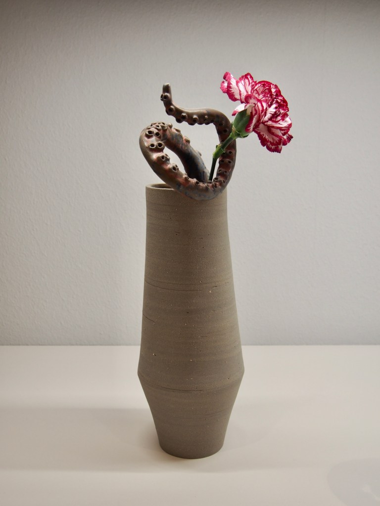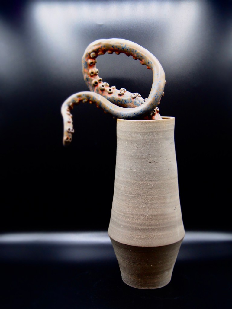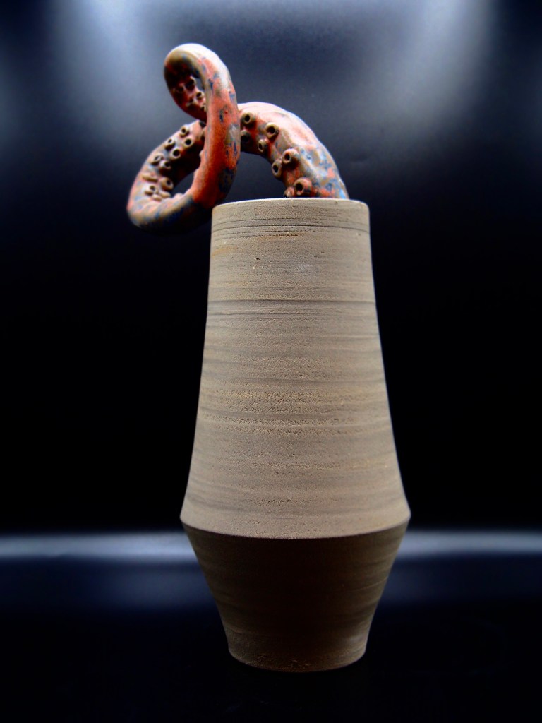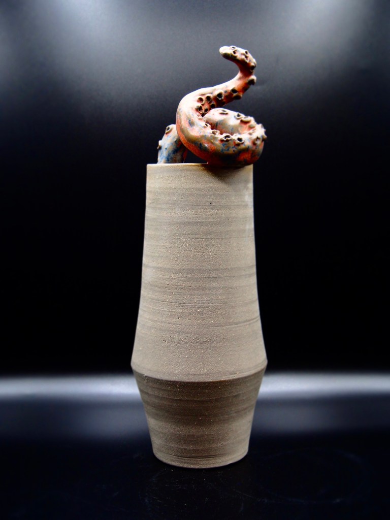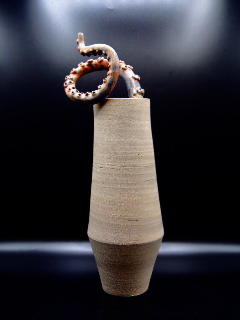 Vase mit Krakenarm, Anthrazitton, Transparent Glasur innen, Krakenarm in Mischglasur mit Effekt (matt)