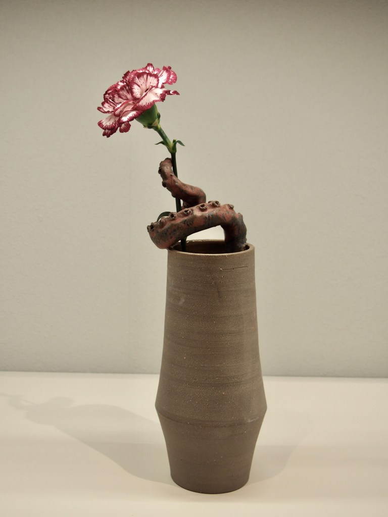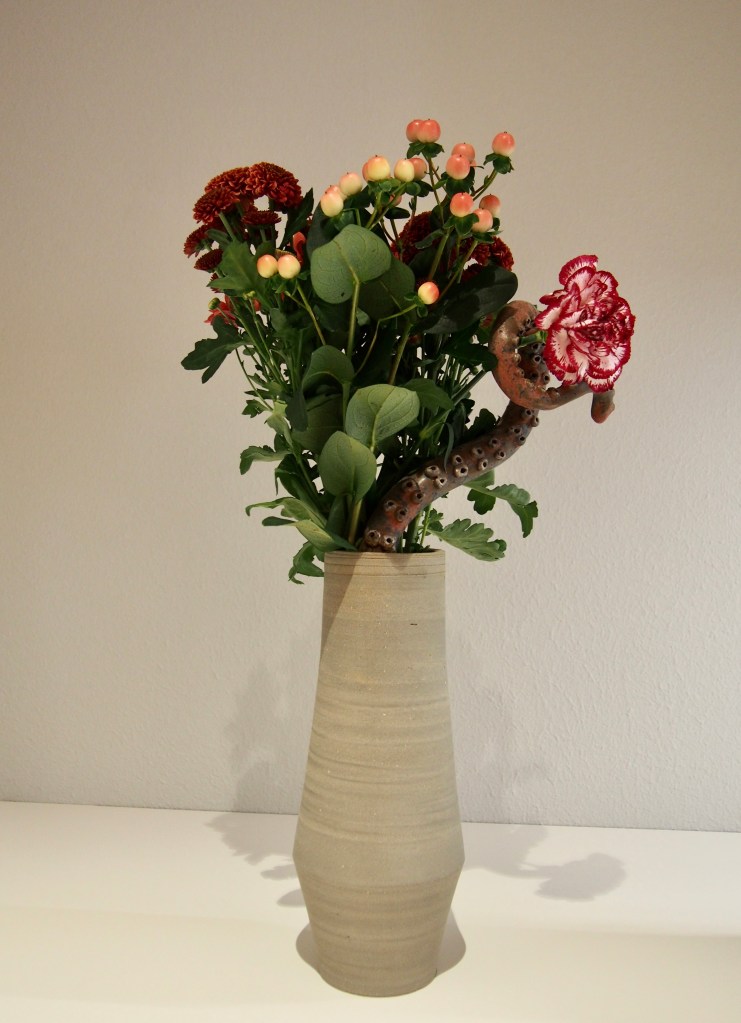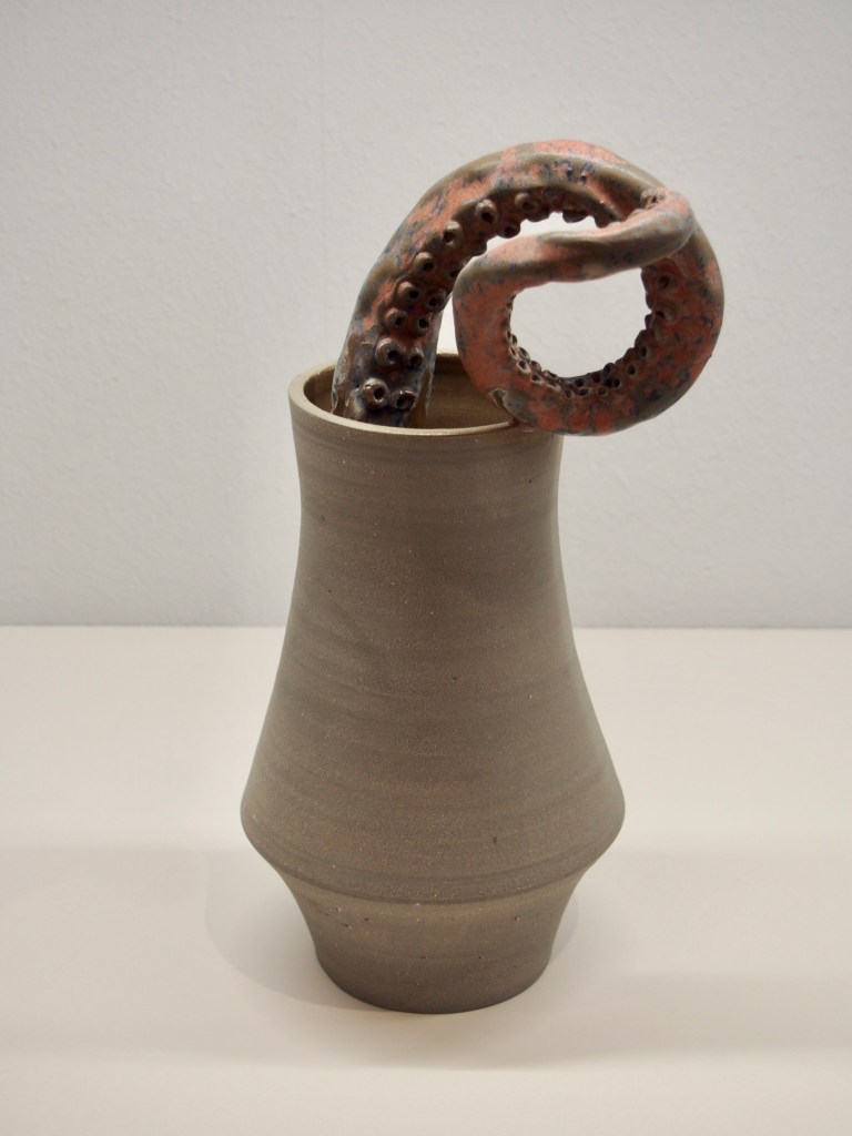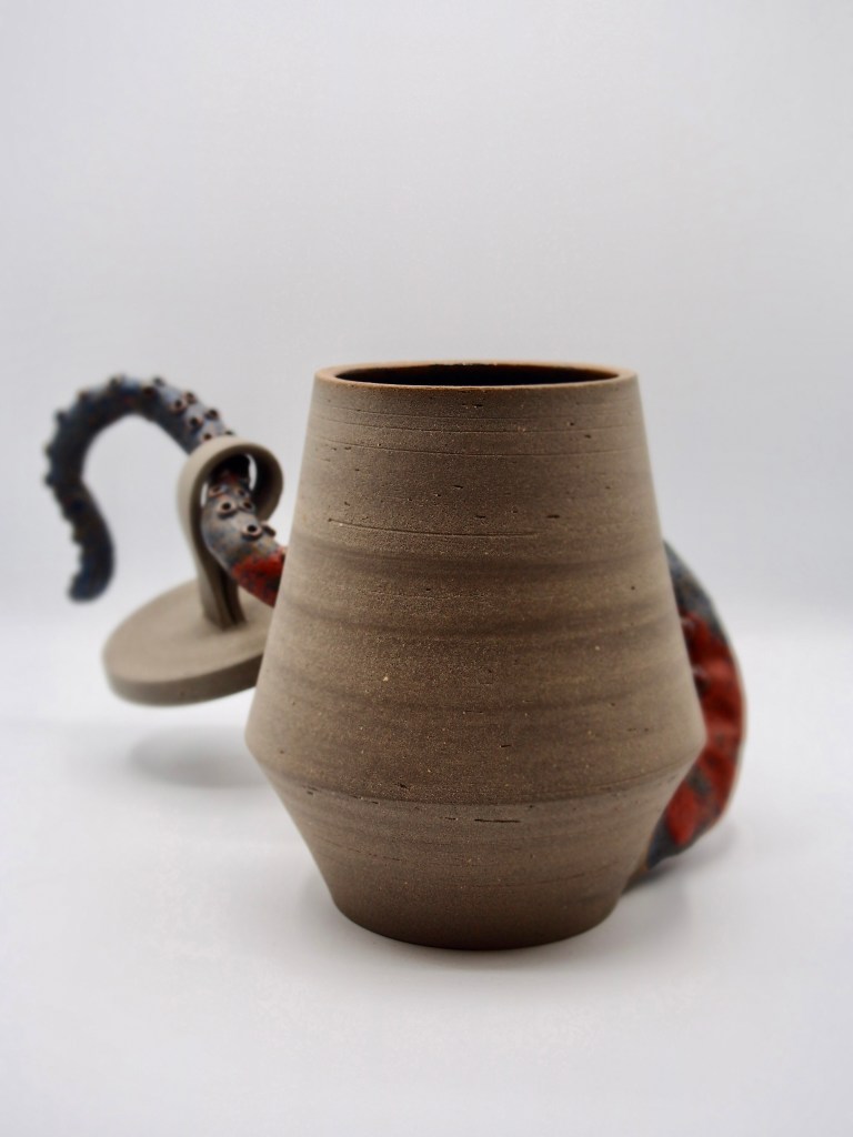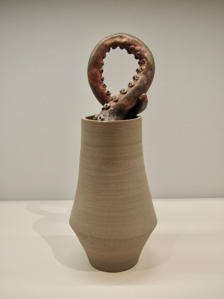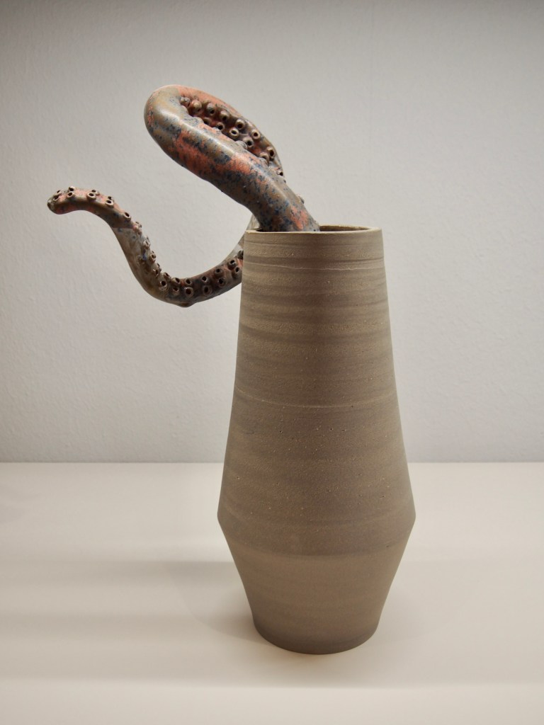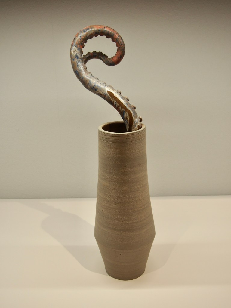 Vase mit Krakenarm, Anthrazitton, Transparent Glasur innen, Krakenarm in Mischglasur mit Effekt (matt)