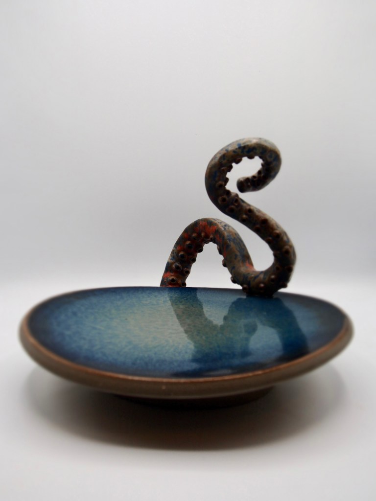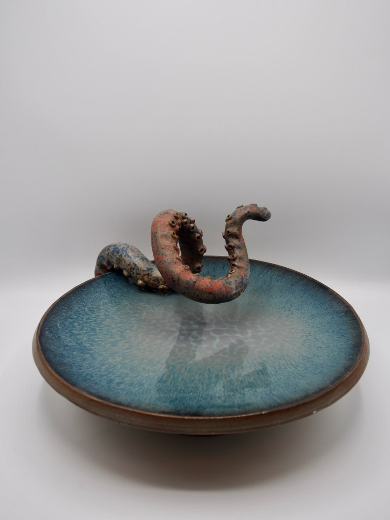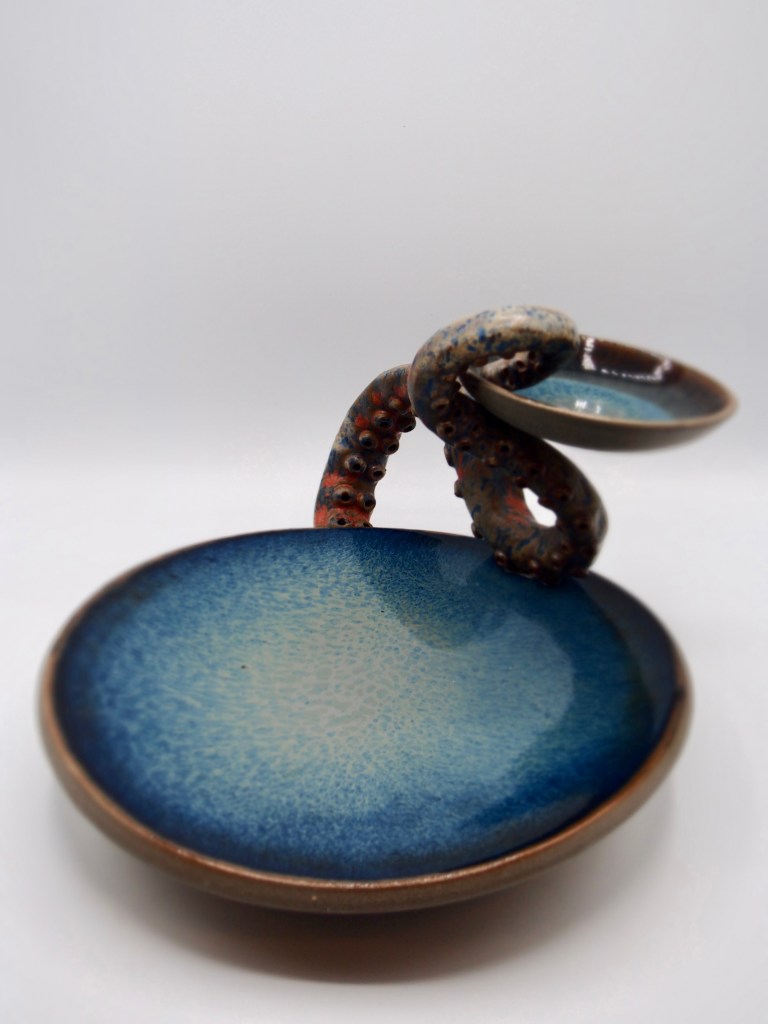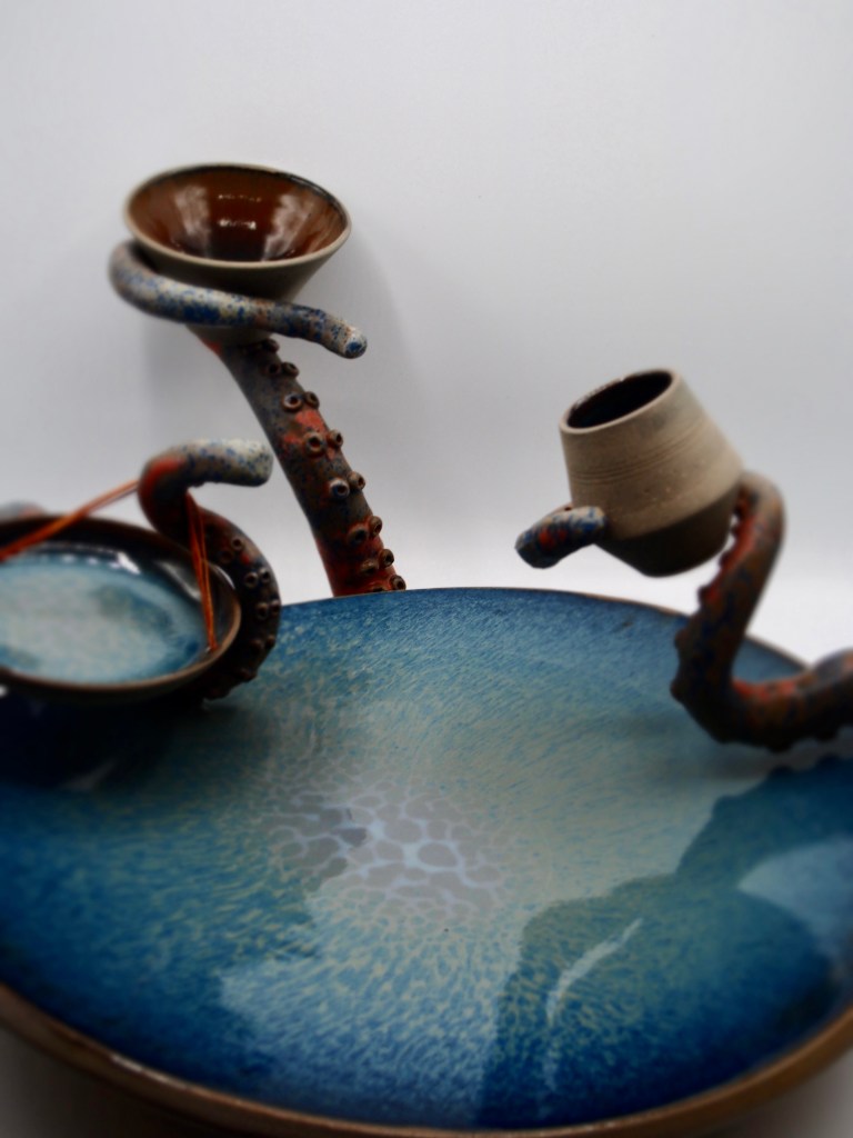 Etagere mit Krakenarm, Anthrazitton, MEER-Glasur auf der Platte, Krakenarm in Mischglasur mit Effekt (matt)