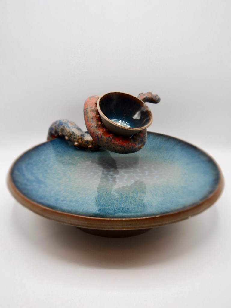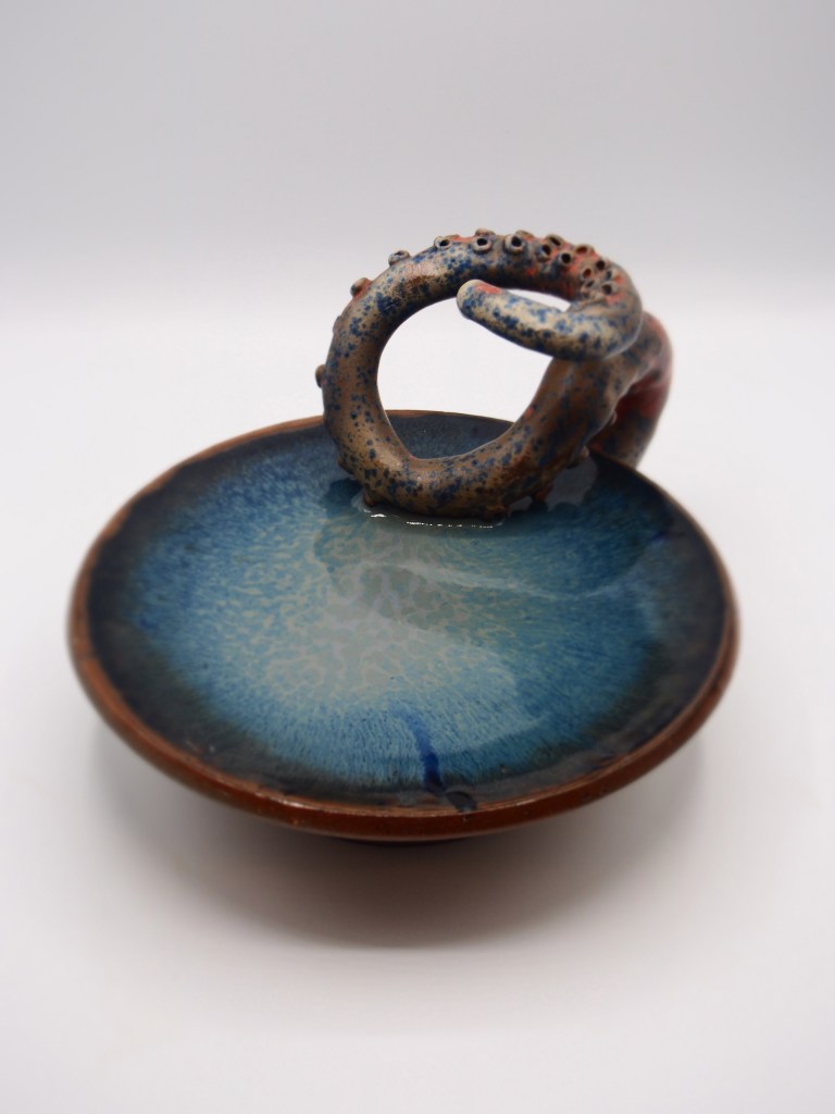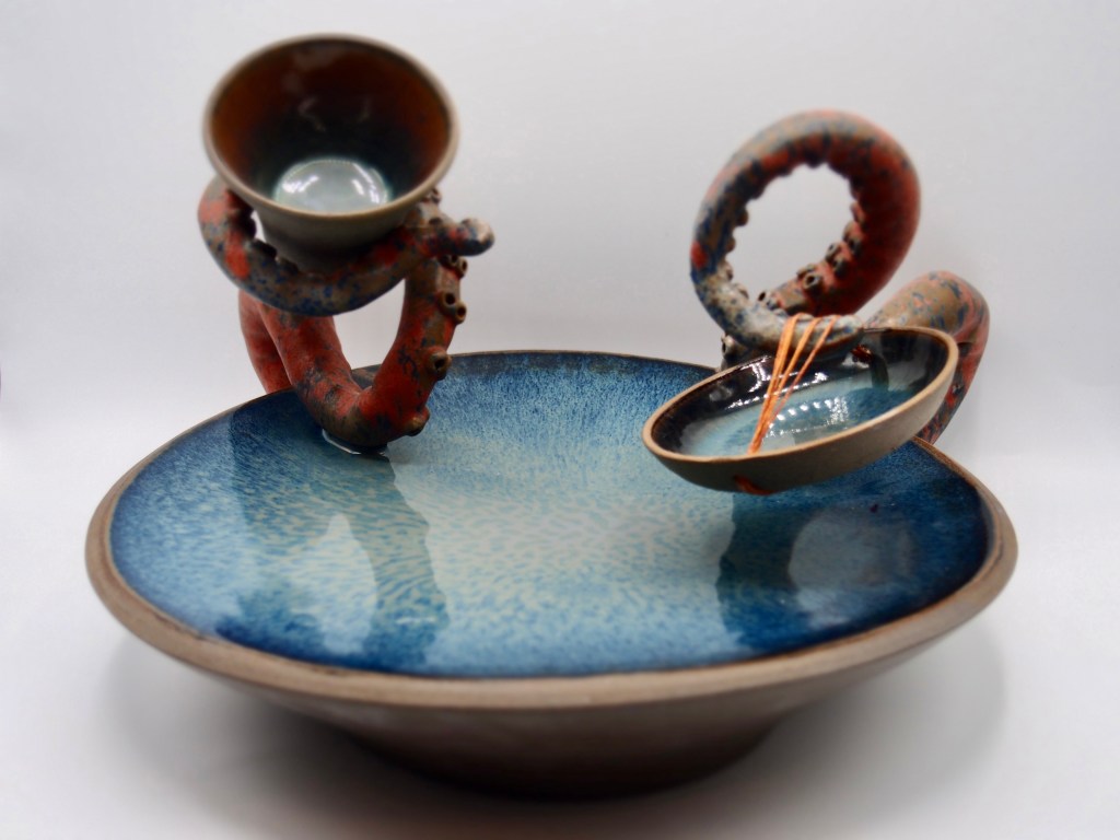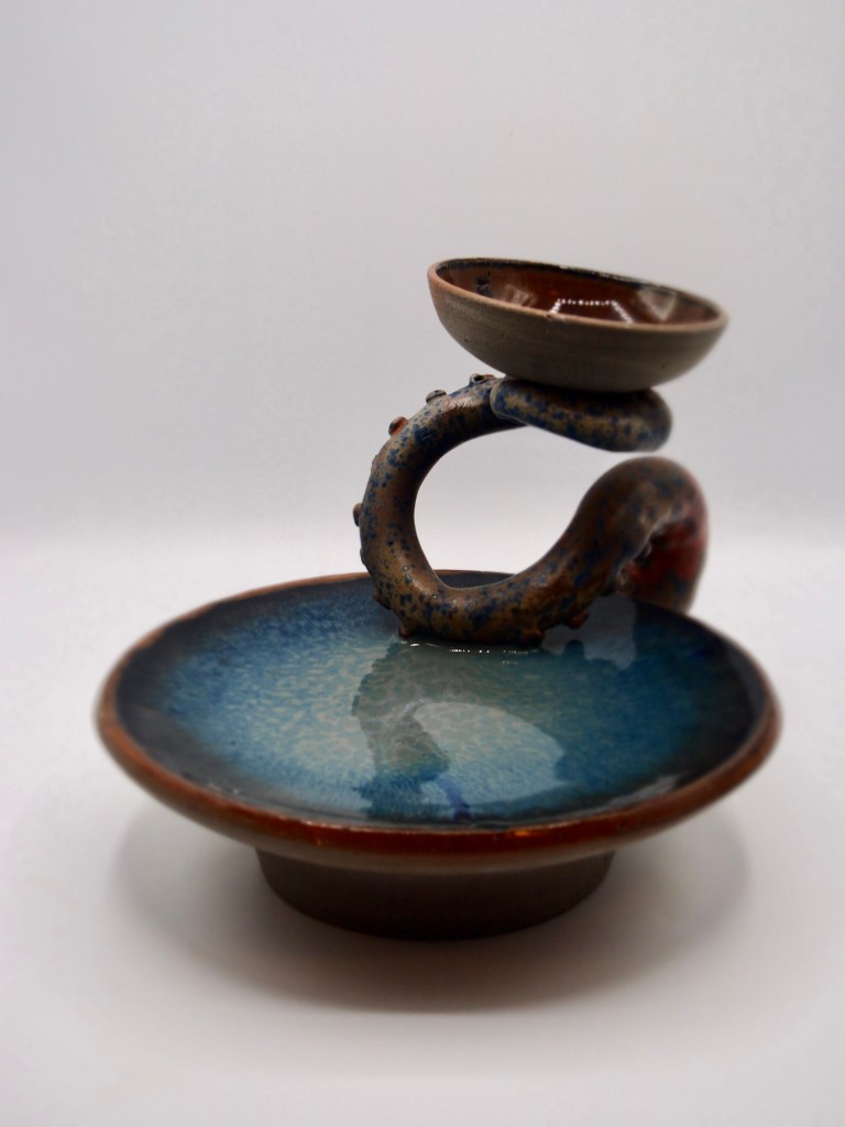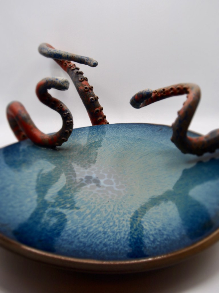 Etagere mit Krakenarm, Anthrazitton, MEER-Glasur auf der Platte, Krakenarm in Mischglasur mit Effekt (matt)