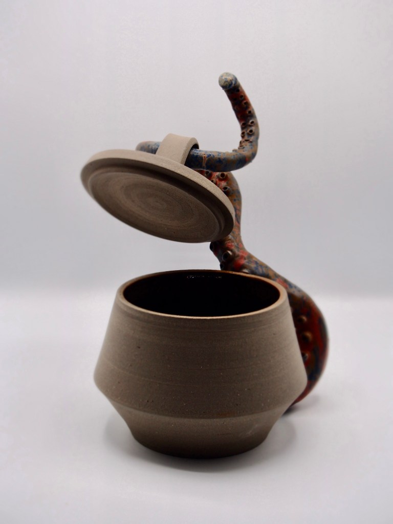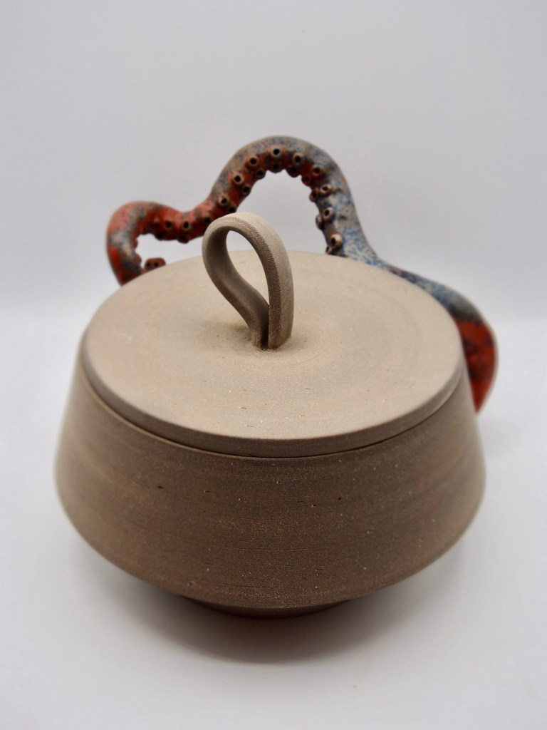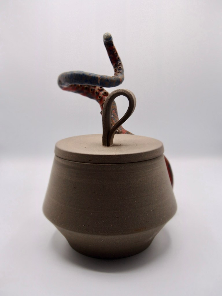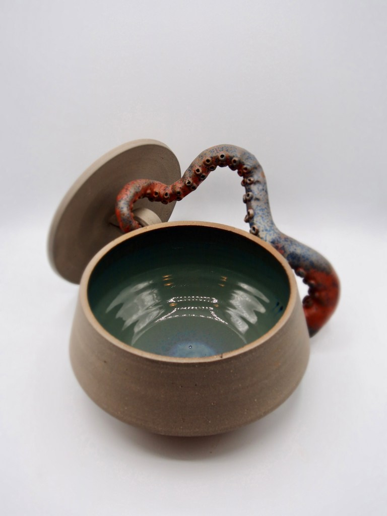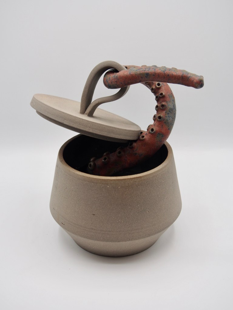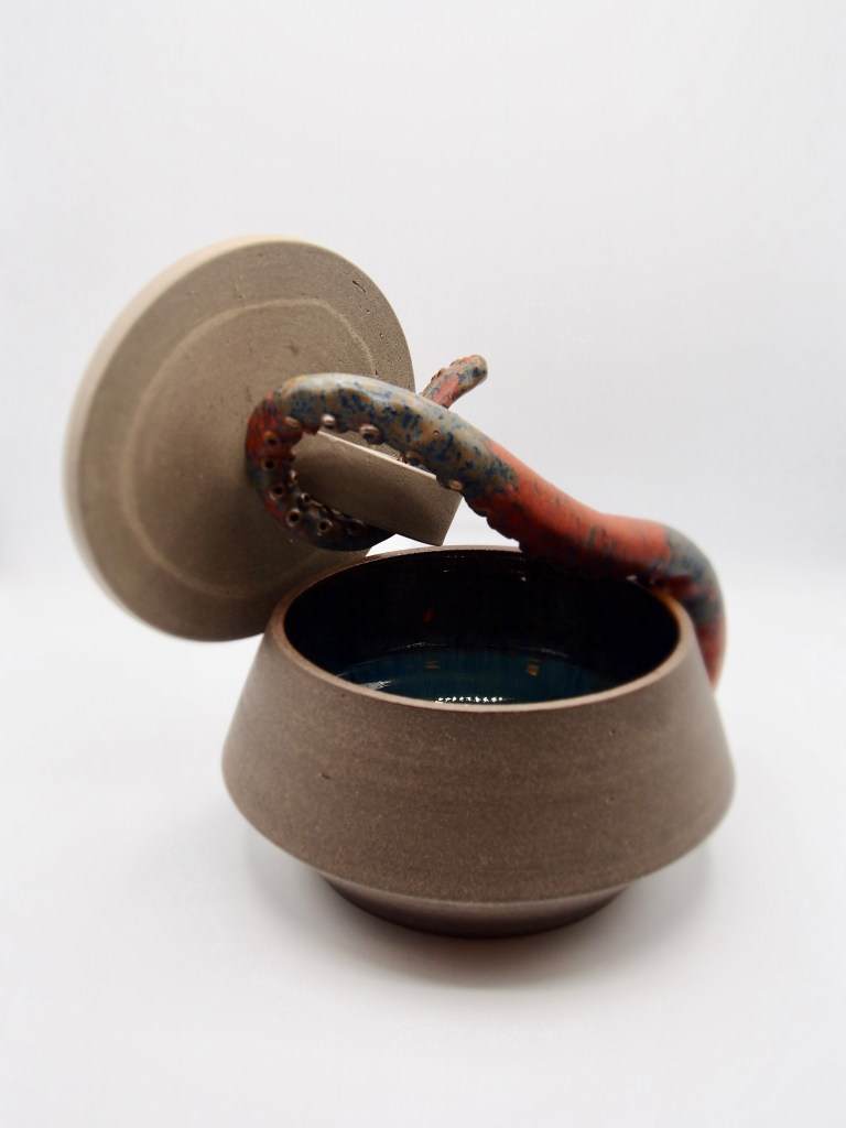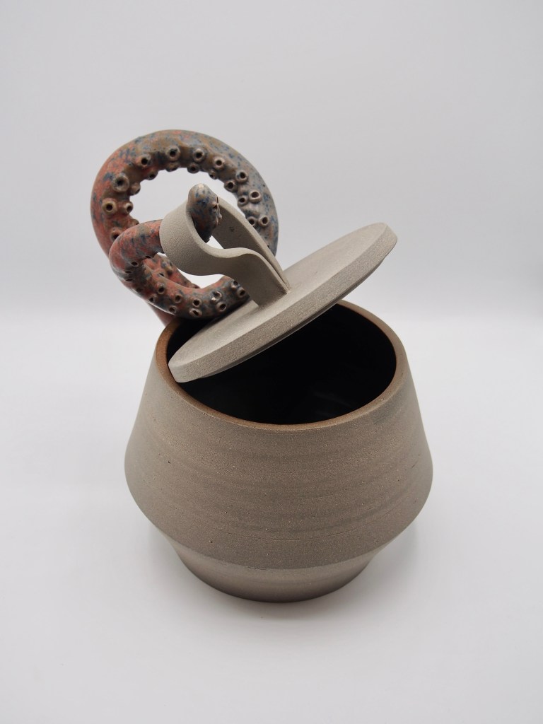 Dose mit Krakenarm, Anthrazitton, MEER Glasur innen, Krakenarm in Mischglasur mit Effekt (matt)