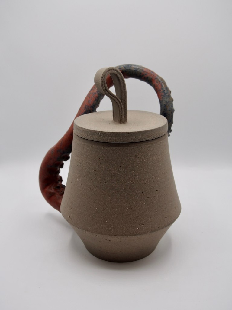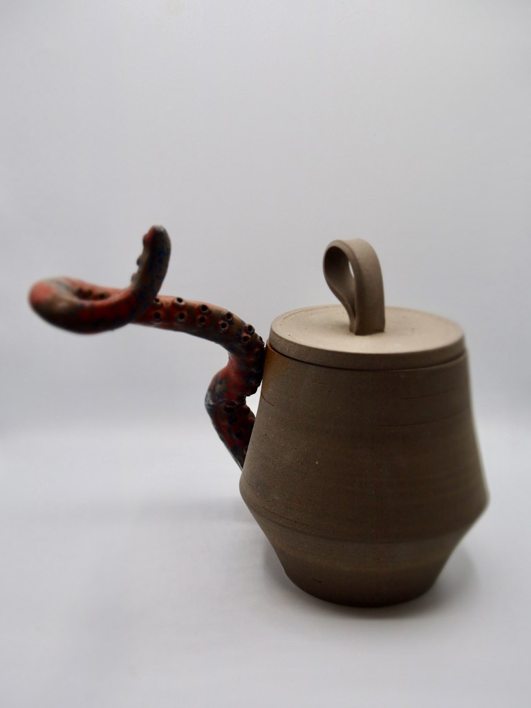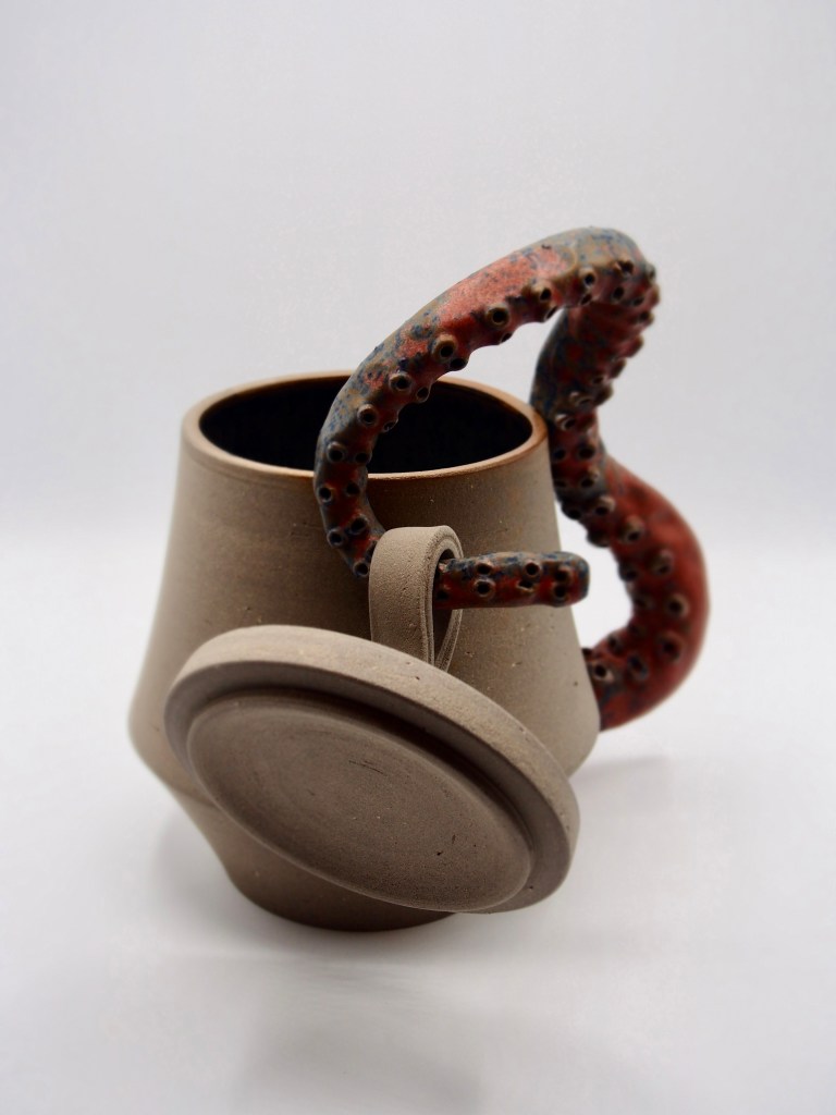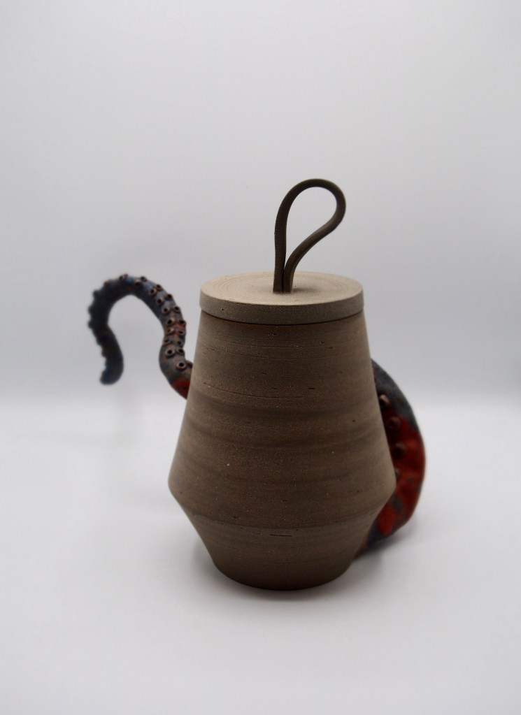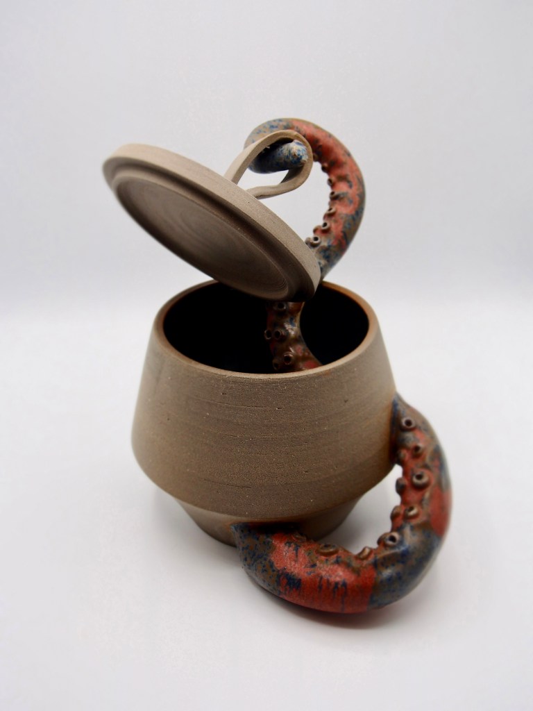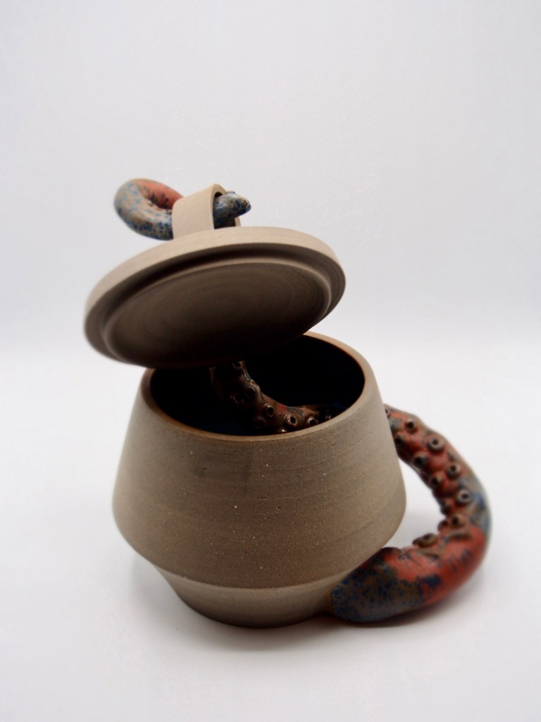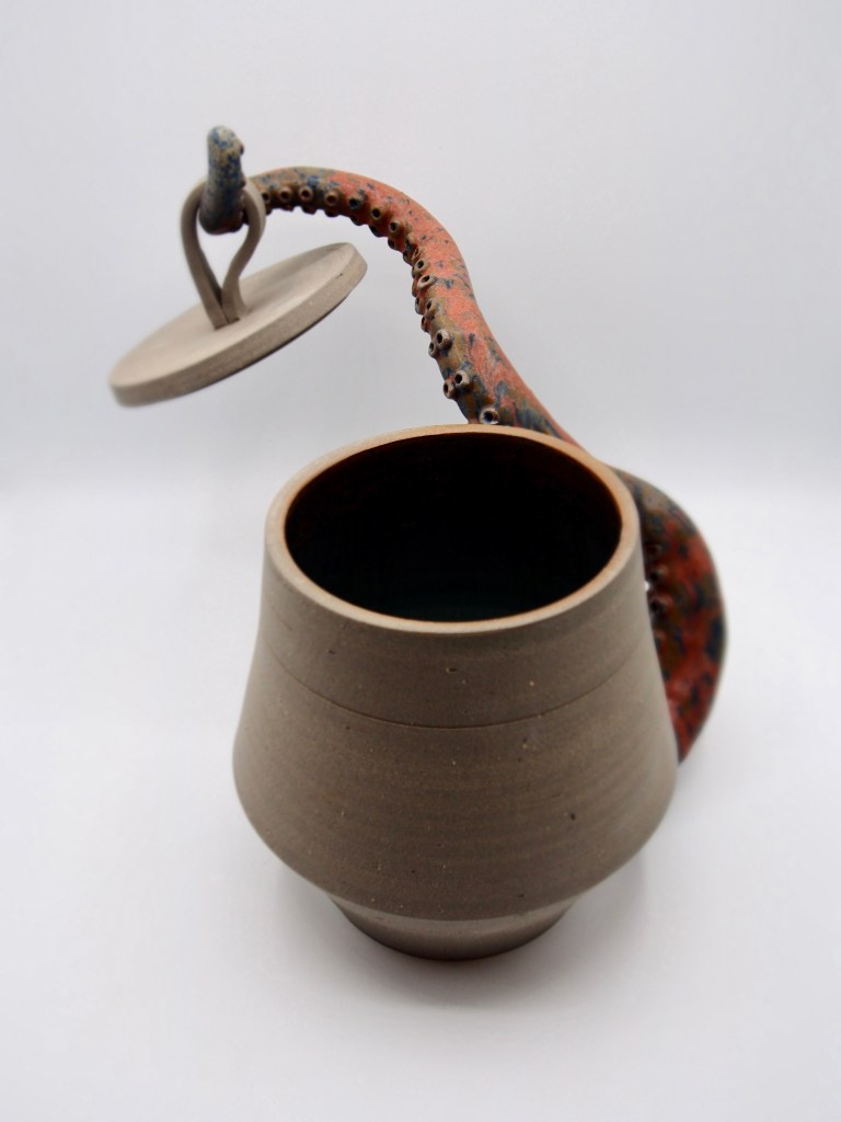 Dose mit Krakenarm, Anthrazitton, MEER Glasur innen, Krakenarm in Mischglasur mit Effekt (matt)